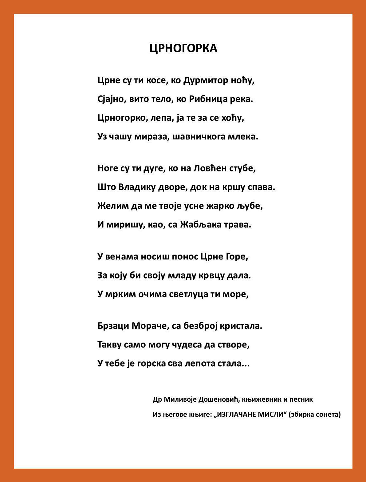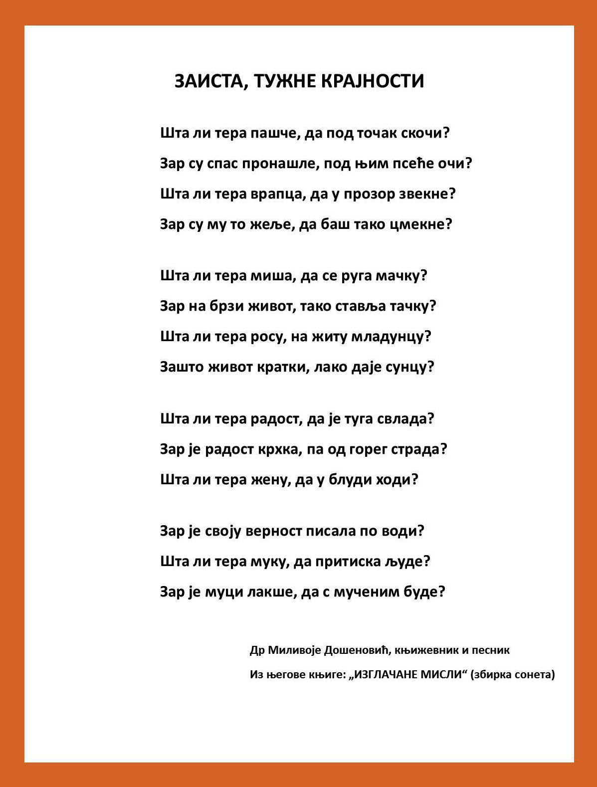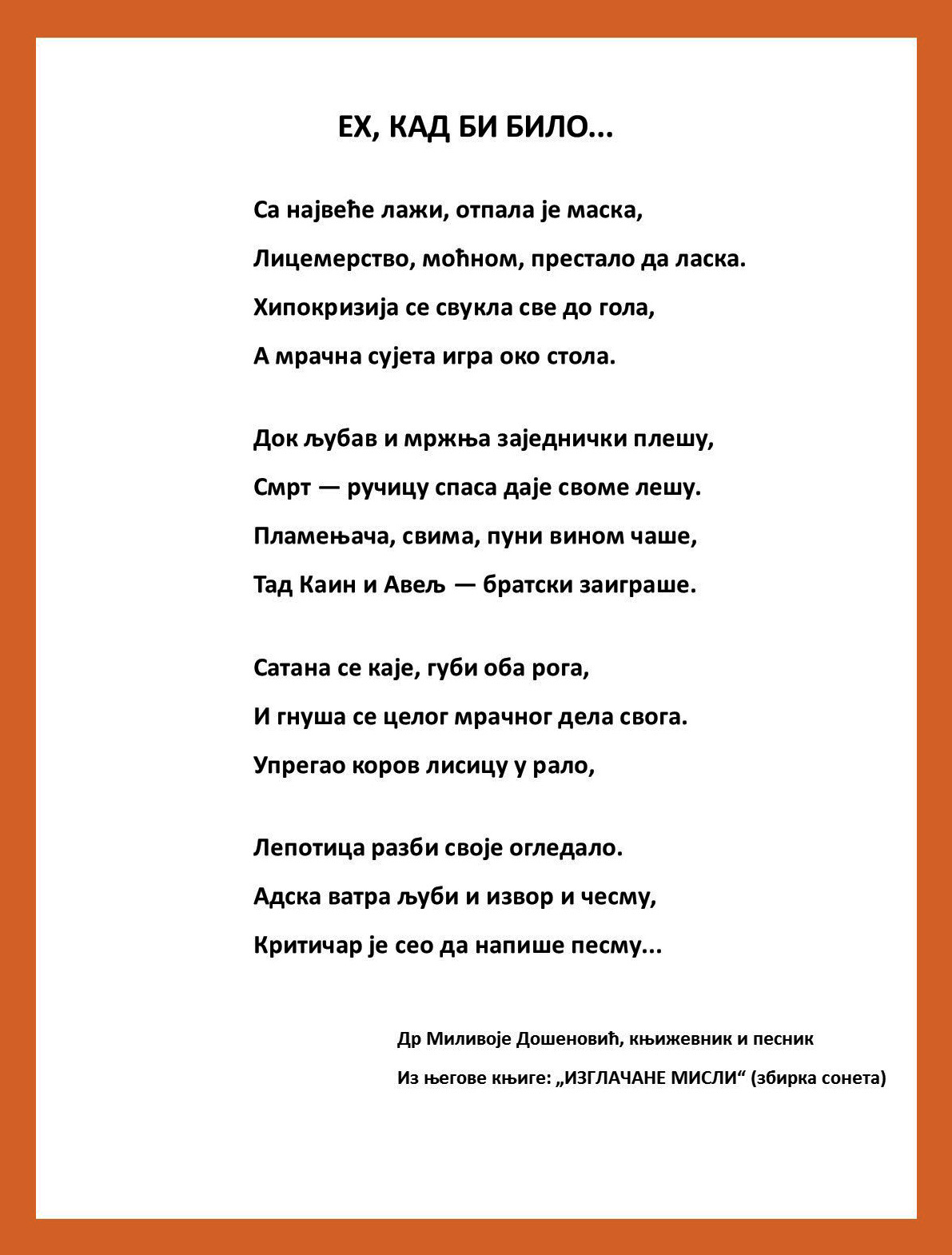 Iz knjige autora dr Milivoja Došenovića: "IZGLAČANE MISLI" (zbirka soneta), koja sadrži oko 160 soneta, izdvojeno je ovde nekoliko soneta, dok se kompletna knjiga (e-book) otvara pritiskom levim tasterom miša na velike prednje korice.