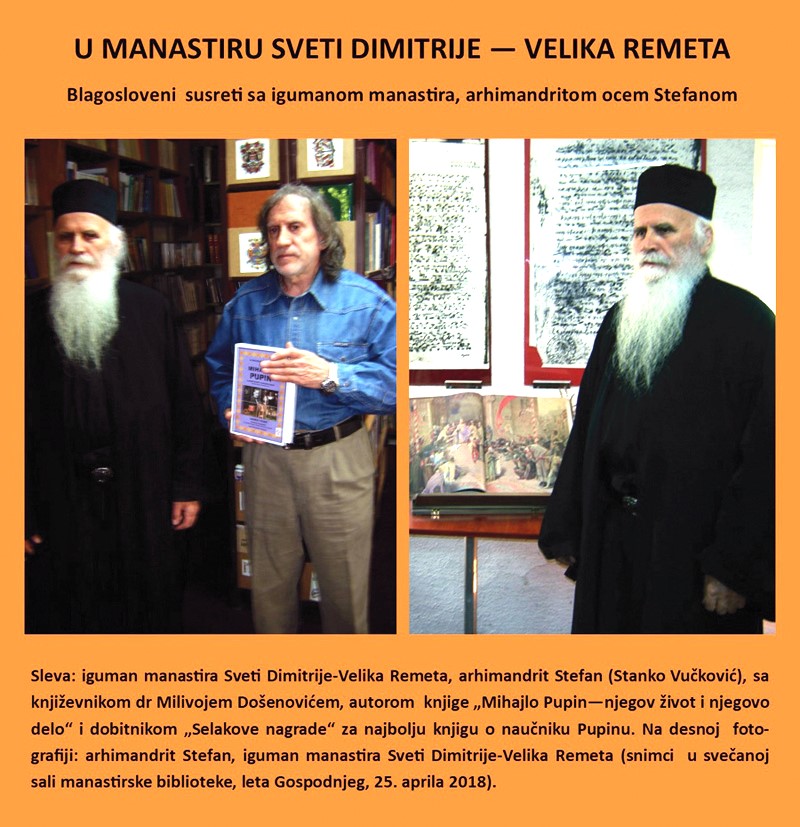 Iguman manastira Velika Remeta, arhimandrit Stefan (Vučković), sa jednim od izdanja knjige: "Mihajlo Pupin - njegov život i njegovo delo" (romansijerska monografija), autora dr Milivoja Došenovića, književnika, koja je dobila svoje mesto u drevnoj manastirskoj biblioteci. Recenzent knjige je prof. dr Zoran Lovreković, doktor nauka informacionih tehnologija sa Univerziteta u Novom Sadu. Pored knjige o Pupinu, pisac dr Milivoje Došenović je poklonio arhimandritu Stefanu za manastirsku biblioteku Velika Remeta još dve svoje knjige: "Spasenje" i "Pegazov let" (zbirke soneta i zbirke sonetnih venaca), iza kojih su stali ugledni recenzenti Arhimandrit Teodor (Suvajdžić) duhovnik manastira Ravanica iz Vrdnika, igumanija manastirska mati Anastasija (Ružica Popović), i prof. dr Radovan Čokorilo, profesor emeritus sa Univerziteta u Novom Sadu. Snimci ispred manastirske knjižare i kod manastirskog konaka: dr Milivoje Došenović, 27. avgusta 2014. godine.