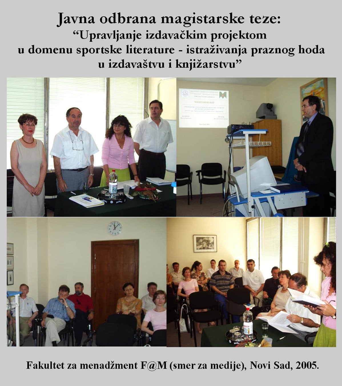Magistrand Milivoje Došenović, nakon javne odbrane magistarske teze: "Upravljanje izdavačkim projektom u domenu sportske literature - istraživanja praznog hoda u izdavaštvu i knjižarstvu" - stekao je akademsko zvanje magistra nauka iz oblasti menadžmenta u medijima VII-2 stepena. Konstrukt magistarskog rada (po ključnoj dokumentacijskoj informaciji) kroz fizički opis rada sadrži: 213 strana, broj poglavlja 11, literaturnih citata 23, slika 15, tabele 172 i grafikona 200. U magistarskom radu su obrađene sledeće naučne discipline: Upravljanje projektima, upravljanje znanjem, strategijski menadžment i menadžment u medijima. Snimci: Aleksandar Agić.