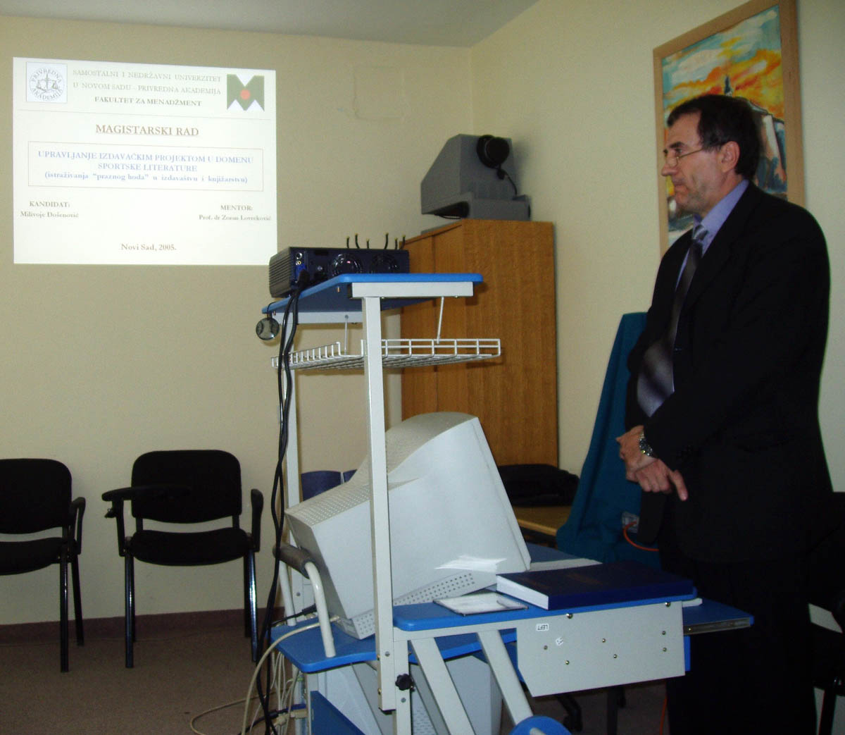 Javna odbrana magistarskog rada, dipl. menadžera - producenta za medije Milivoja Došenovića, na Fakultetu za menadžment u Novom Sadu. Snimak: Aleksandar D. Agić, sa novosadske "TV Kanal 9", u Novom Sadu, 2005.