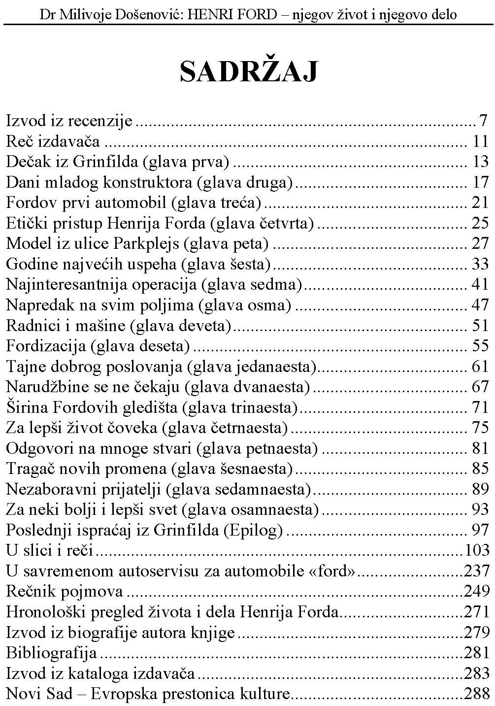 - Rečnik pojmova u knjizi: Kao dragoceni prilog separatnog i lapidarnog karaktera, koji se odnose na automobil, automobilsku industriju, i sve što je bilo u bliskoj povezanosti Henrija Forda i njegovih savremenika iz nauke i tehnike, sa kojima je sarađivao (opisana je i neosporna saradnja sa slavnim naučnikom Nikolom Teslom, koju je dezavuisao Tomas Alva Edison, kao prvi poslodavac Henrija Forda).