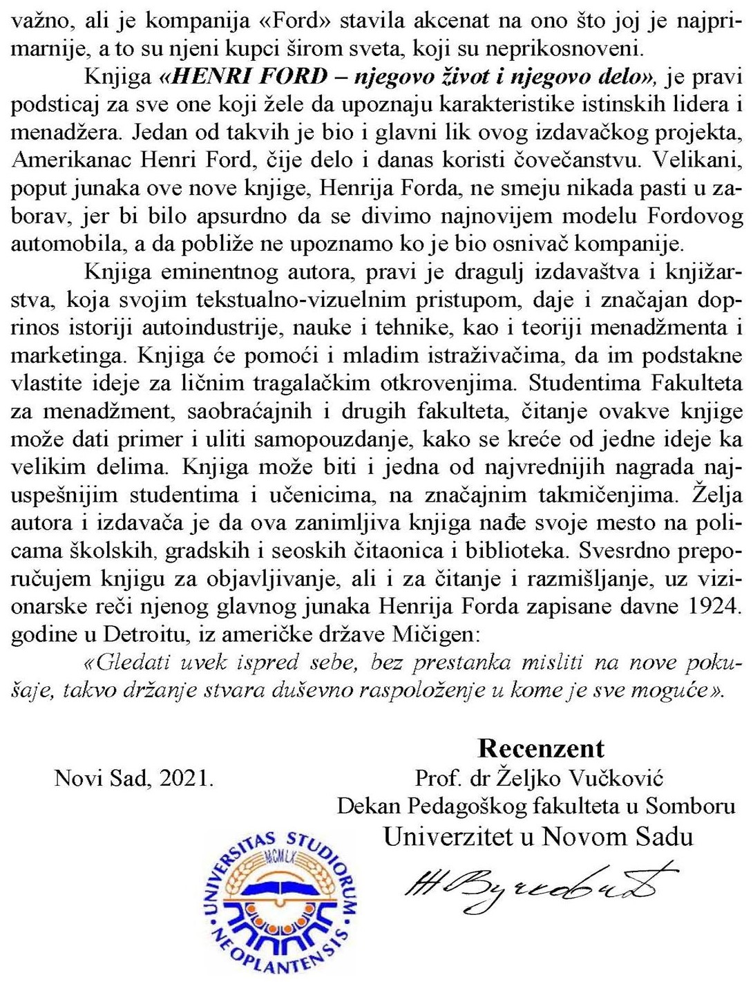 Recenzija prof. dr Željka Vučkovića, doktora bibliotečko-socioloških nauka i dekana (sada eks dekana) Pedagoškog fakulteta iz Sombora, nalazi se i u samoj publikaciji: "HENRI FORD - njegov život i njegovo delo" (monografska edicija), književnika i doktora nauka Milivoja Došenovića, redovnog člana Društva književnika Vojvodine.