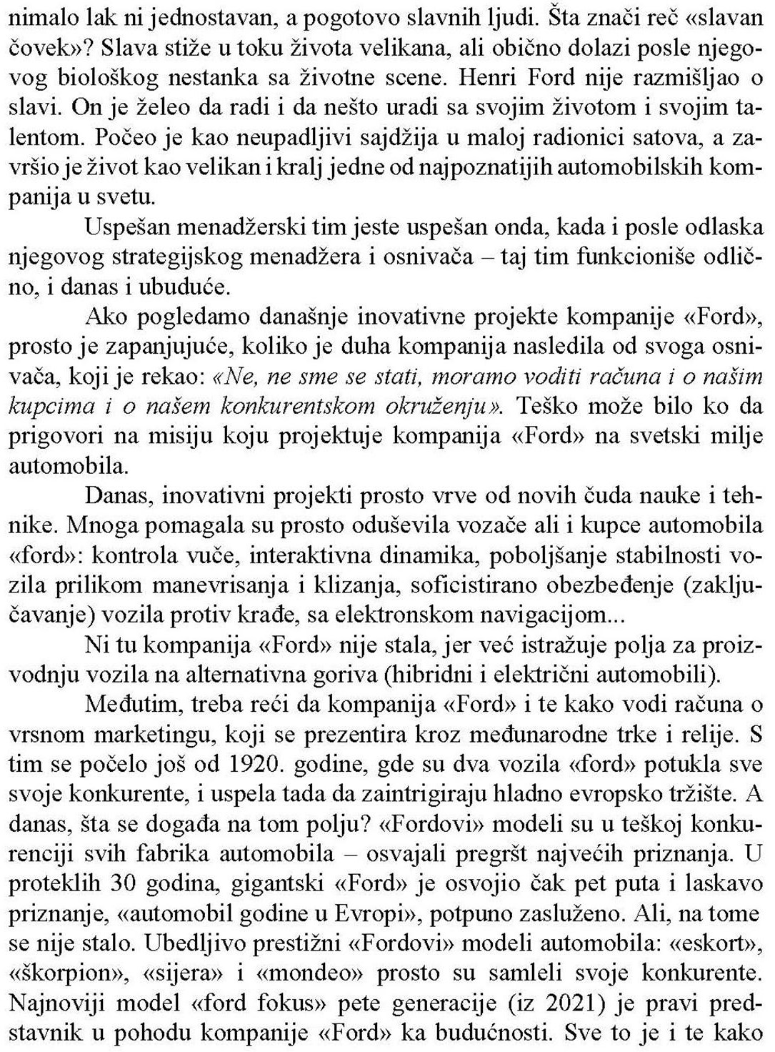 - Prikaz razvoja industrije: Knjiga autora dr Milivoja Došenovića detaljno opisuje život i rad industrijalca Henrija Forda, osnivača automobilske industrije kakvu danas poznajemo. Učenici i studenti mogu iz nje naučiti o istorijskom razvoju masovne proizvodnje, kao i o značaju inovacija i uticaju tehnologije na savremeno društvo.