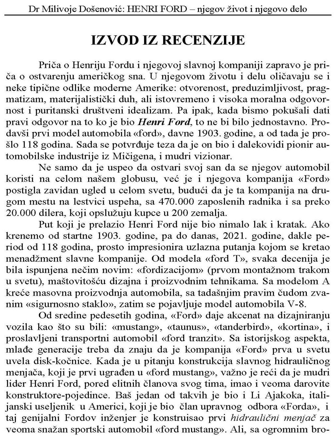 Knjiga "HENRI FORD - njegov život i njegovo delo", autora i srpskog književnika dr Milivoja Došenovića, objavljena je u šest izdanja (2004-2021), predstavlja priznatu monografiju, koja obrađuje zanimljive teme, ali i šire od toga i na veoma pristupačan i edukativan način. Uključivanje ovakvog dela (koje pripada naučnoj književnosti) u obrazovni kontekst ili preporuka mladima za čitanje - može značajno doprineti razvoju veština i mentaliteta potrebnih za uspeh u 21. veku u Republici Srbiji. O književno-naučnom konstruktu ove knjige, ovde će biti reči i kroz Recenziju prof. dr Željka Vučkovića (1960-), dekana Pedagoškog fakulteta iz Sombora.