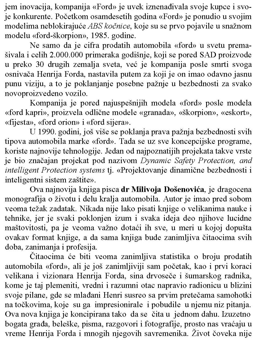 "HENRI FORD - njegov život i njegovo delo" (monografska edicija), autorsko delo dr Milivoja Došenovića, srpskog književnika. Prvo izdanje ove knjige objavljeno je 2004. godine u produkciji Izdavačke kuće "Domla-Publishing" iz Novog Sada, potom su sledila izdanja iz 2005, 2006, 2008. godine. Prvo njeno digitalno izdanje (PDF-formata) objavljeno je 2013. godine. Nastavak doprinosa imenu i delu Henrija Forda I, kao i još bolje upoznavanje o njegovom životu i radu - doprinelo je i 6. dopunjeno štampano izdanje iz 2021. godine, autora i doktora nauka Milivoja Došenovića, posvetivši i poseban prostor knjige i Henriju Fordu II, koji je nastavio da vodi i unapređuje slavnu kompaniju nakon odlaska sa životne scene njegovog oca Edzela i slavnog dede Henrija I. Misija autora i izdavača ove dragocene knjige, čije je prvo izdanje objavljeno 2004. godine u tadašnjoj državi Srbiji i Crnoj Gori, bila je i sa ciljem da se popuni ogromna praznina, koja se primećivala u vidu nedostatka savremenije knjige (o slavnom industrijalcu iz Detroita), ali koja bi u svom knjižnom bloku imala još bogatiji tekstualno-vizuelni konstrukt. Autor dr Milivoje Došenović je od prvog izdanja svoga dela o Fordu - za knjigu napisao i separat bogatog Rečnika lapidarno složenih pojmova, koji se svi odnose na automobil i autoindustriju, sa akcentom na pionira autoindustrije u svetu Henrija Forda I, ali i na njegove savremenike, koji su bili sa njim prisno poslovno povezani. Bogat Rečnik pojmova u izdanjima knjige je dupunjavan novim prilozima. Ova knjiga nije Fordova knjiga, već je ova publikacija knjiga o Fordu, u kojoj je kroz 6. dopunjeno izdanje oukviren jedan celovit knjižni konstrukt, koji obrađuje dva perioda iz života Henrija Forda: Prvi period (1863-1947), i drugi period - u kome se opisuju događaji posle njegovog biološkog odlaska, sa Epilogom knjige u kome je velikan svetske autoindustrije imao poslednji veličanstven ispraćaj iz njegovog rodnog Grinfilda. Ovo delo autora i književnika dr Milivoja Došenovića opisuje i dešavanja iz današnjeg savremeništva - o visokom respektu koji je i u XXI veku zadržala kompanija "Ford" iz Detroita, nudeći svetskom tržištu svoje nove modele i najsavremenijih hibridnih i električnih automobila... REDAKCIJA