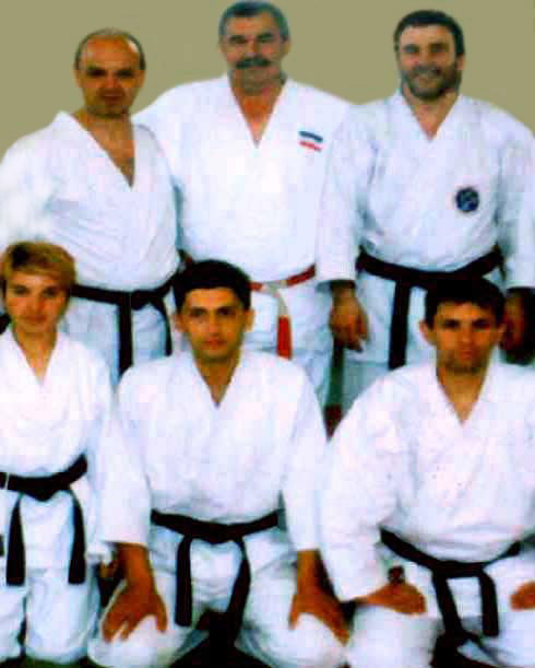Sleva: Mr Dušan J. Dačić, savezni selektor karate reprezentacije Jugoslavije sa dr Milivojem Došenovićem, glavnim i odgovornim urednikom izdavačke kuće "Domla-Publishing" iz Novog Sada (snimak u sali za borilačke sportove Srednje škole unutrašnjih poslova "Pane Đukić" iz Sremske Kamenice, 1998). Na fotografiji desno, sleva u gornjem redu: mr Dušan Dačić, prof. dr Slavko Obadov (1948-2025), savezni selektor judo reprezentacije Jugoslavije, i dr Milivoje Došenović (snimak u sali za borilačke sportove SŠ unutrašnjih poslova "Pane Đukić" iz Sr. Kamenice, 1998).
