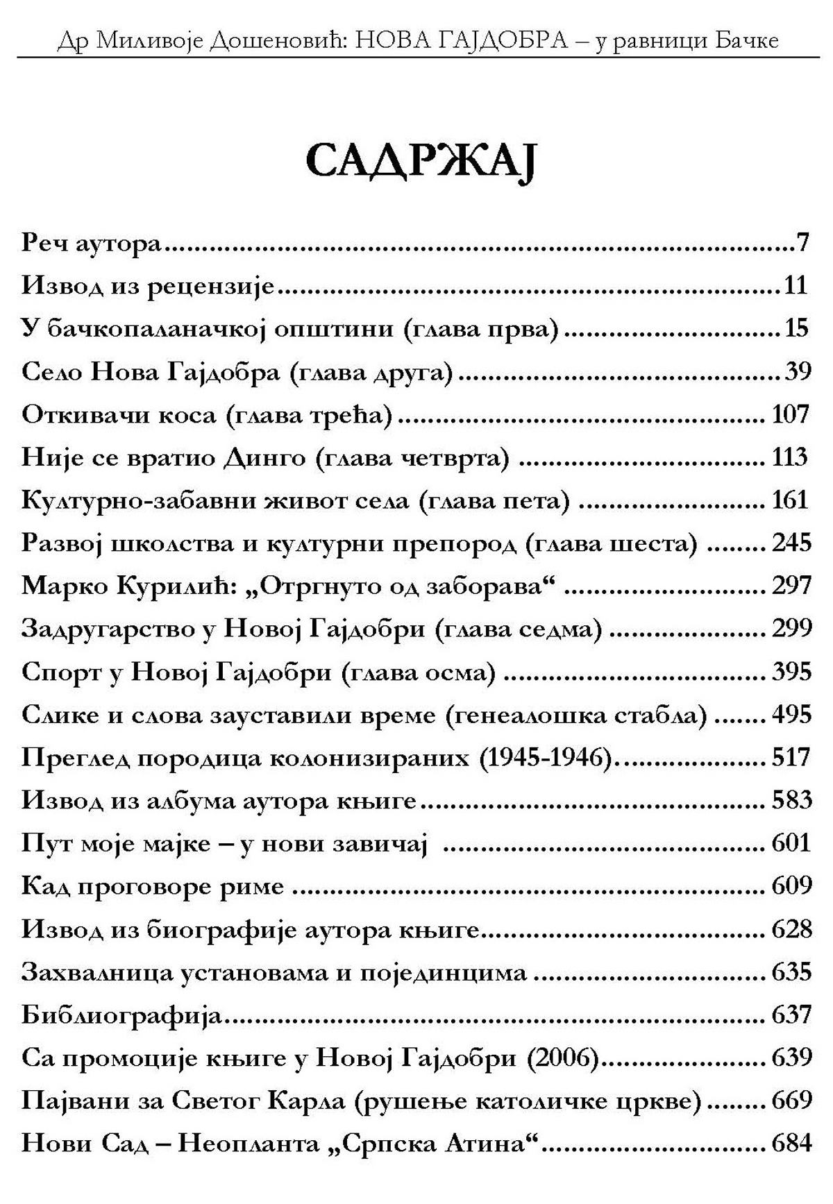Najveći deo slika (320) je iz lične foto-arhive autora knjige dr Milivoja Došenovića, zajedno sa savremenim fotografijama, koje je lično snimio autor ovog dela. Ostale slike, koje su striktno vezane za Novu Gajdobru, autoru knjige lično su ustupljene od žitelja sela i iz arhivarija: lovačkog društva "Zec", fudbalskih klubova "Mladi zadrugar" i "Soko", iz odbojkaške i šahovske arhive, kao i razne slike iz arhive Zemljoradničke zadruge "Jadran" u Novoj Gajdobri. U knjizi je spisak sa 1.614 koloniziranih meštana, naseljeni 1945-1946. godine u Novu Gajdobru, i Spisak je lično uručen autoru ove knjige od Matične službe u selu, i taj spisak se nalazi i u prvom izdanju knjige (2006). Ovo književno delo od 1-16. izdanja sadrži svoju urednu Bibliografiju sa 31 izvorom, koje je autor ove knjige naučno proučavao. Ali, posebno su naznačeni i izvori u fusnotama sa imenima autora, čiji delovi iz teksta knjige su u 1. i 2. glavi korišćeni u ovoj knjizi, zajedno sa tekstom autora ovog dela, uglavnom o kraćem istorijatu opštine i geografskim podacima Bačke Palanke i Nove Gajdobre, uz nekoliko pedoloških karata. Ova knjiga nije hronologija ni hronografija, već romansijerska monografija. Autor se nije opširnije bavio statistikom, već životom i događajima. Slike, koje je snimio kamerman TV "Kanal 9" iz Novog Sada Aleksandar Agić, kao poslovni saradnik izdavačke kuće "Domla-Publishing", pripadaju ličnoj arhivi autora ove knjige. Od naseljavanja prvih kolonista Srba sa Kosmeta i BiH u Novu Gajdobru (1945/1946), ovo je jedina objavljena knjiga o Novoj Gajdobri, koja je u potpunosti zadovoljila književnu i akademsku formu.